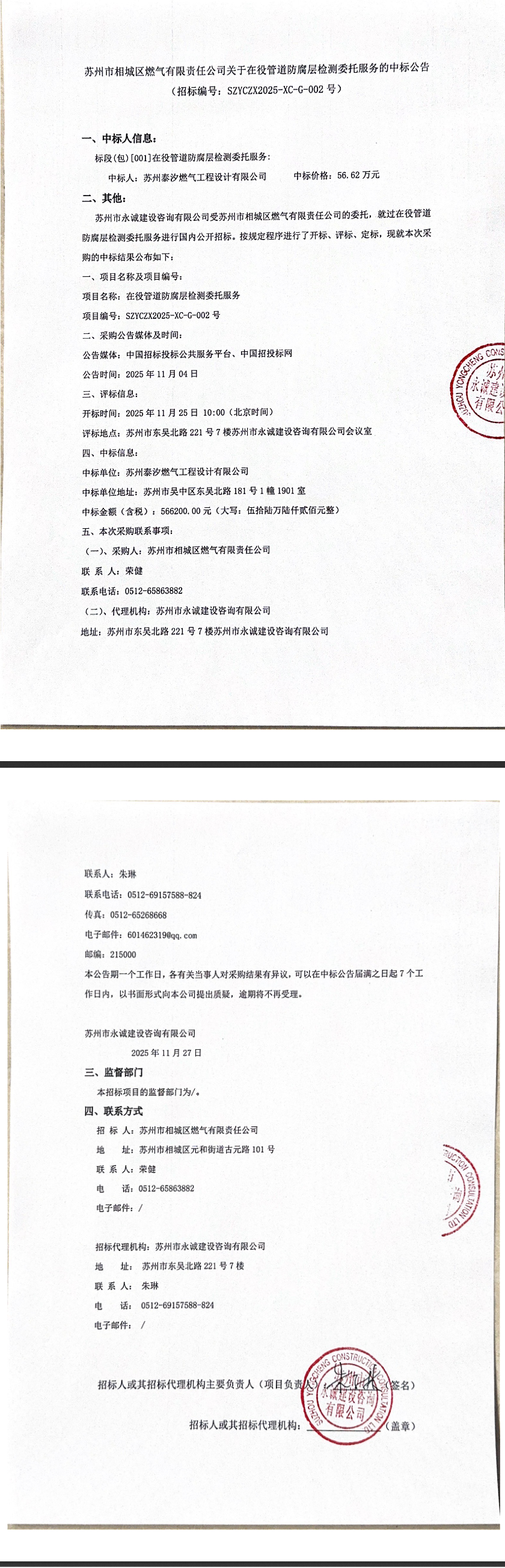 苏州市相城区燃气有限责任公司关于在役管道防腐层检测委托服务的中标公告